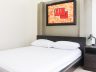 - The bedroom features a queen size platform bed with a headboard against the flaxen accent headboard wall. Daylight from the window wall brightens the room