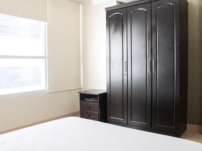 - Across the bed is a dark three-panel wooden cabinet and a matching side table with drawers