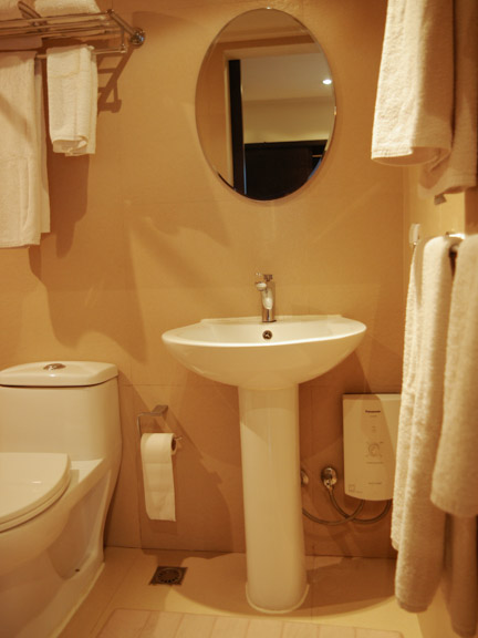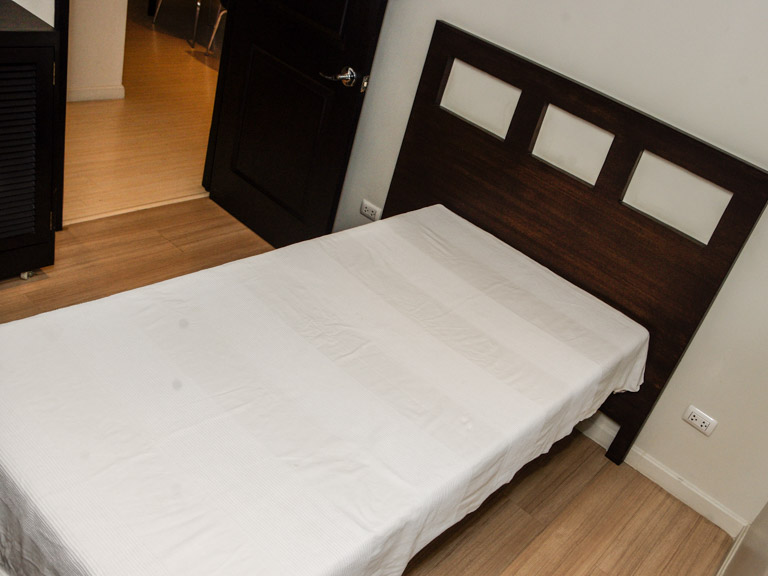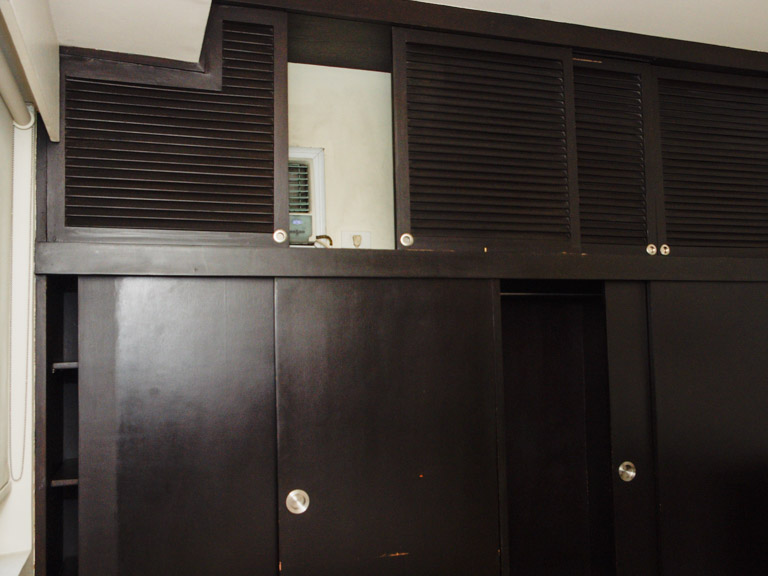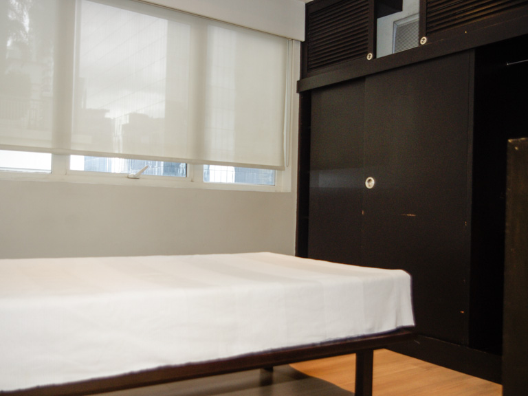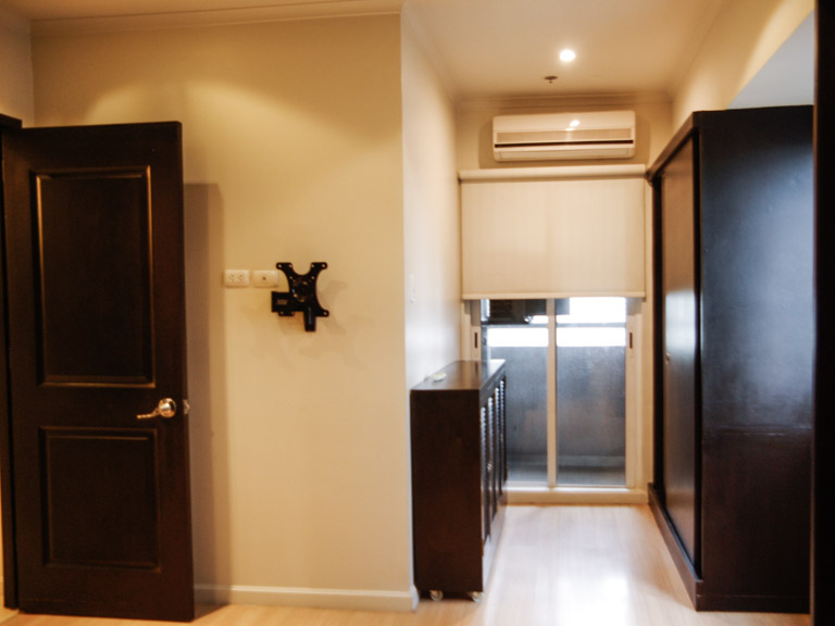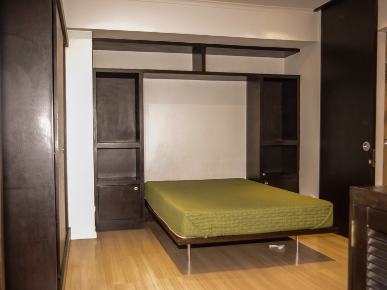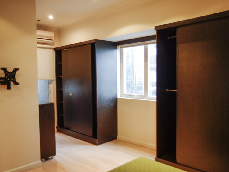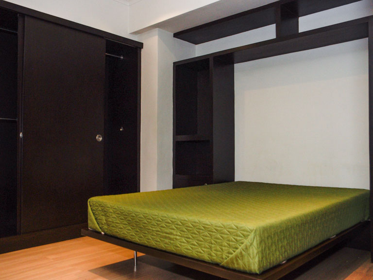- First room has a fold out wall bed with cabinet on the side to place most of your personal stuff, furthermore, towards the balcony is a large wood-toned wardrobe-cabinet
