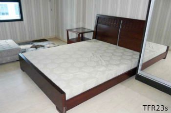 - Bedroom 1 features a dark wooden platform bed with a headboard and a matching bedside table, cabinet with mirrored sliding doors, an area rug and sofa