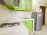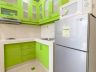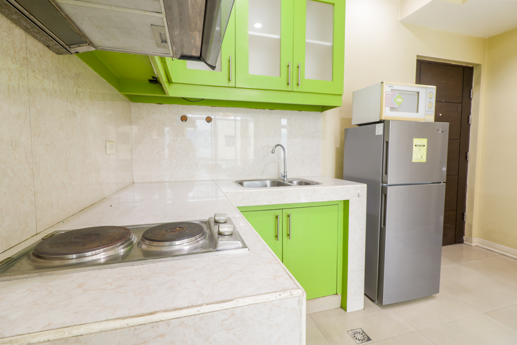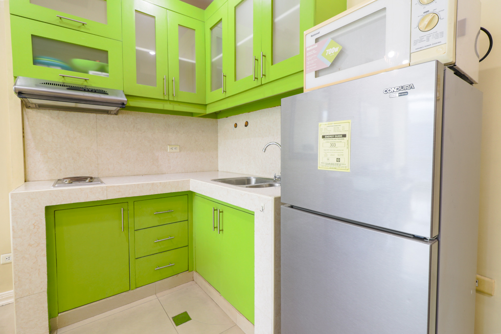 • Kitchen is equipped with microwave, two door refrigerator, and two burner electric stove with range hood