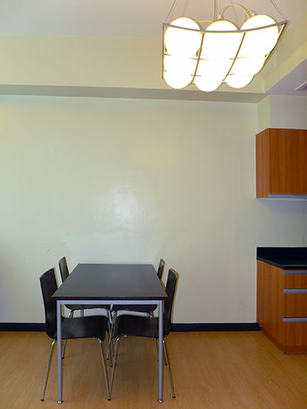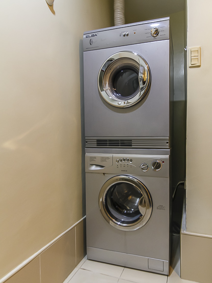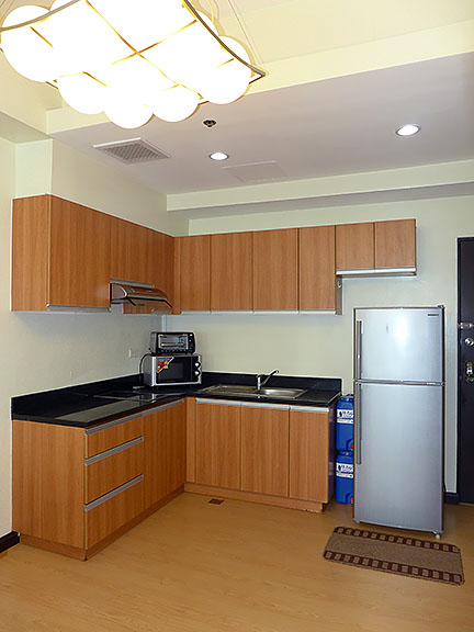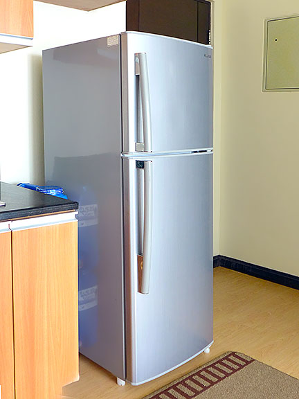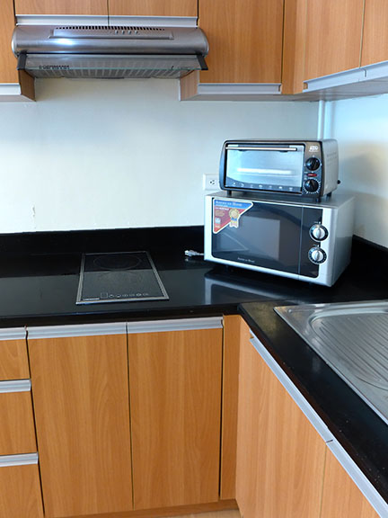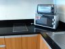 - A corner kitchen provided of a two door fridge, cooktop, rangehood and sufficient storage for cookware