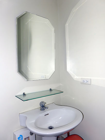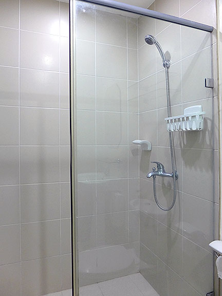 - Comfort room with heater and a shower with glass panel separator from toilet area