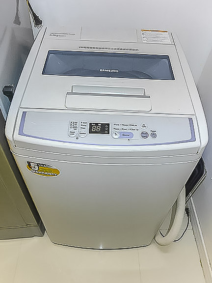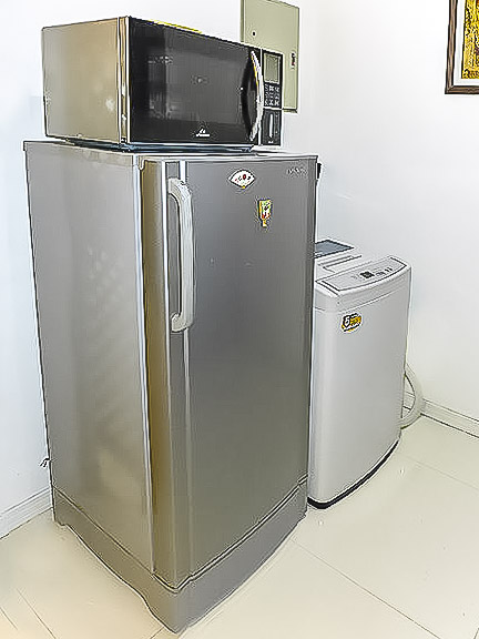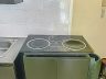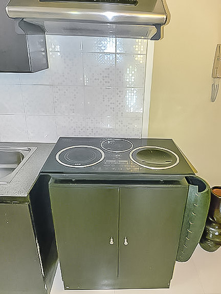 - Two-door ref, induction stove with range hood, microwave oven and washing machine in kitchen
