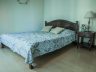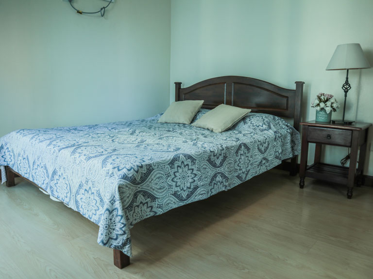 • The bedroom is fitted with a queen-sized bed, side table with lamp, and a mirrored dresser