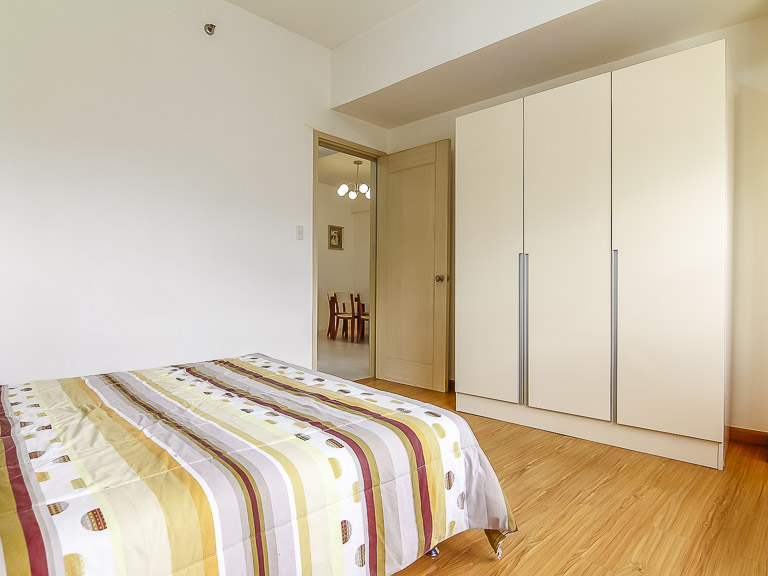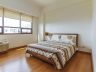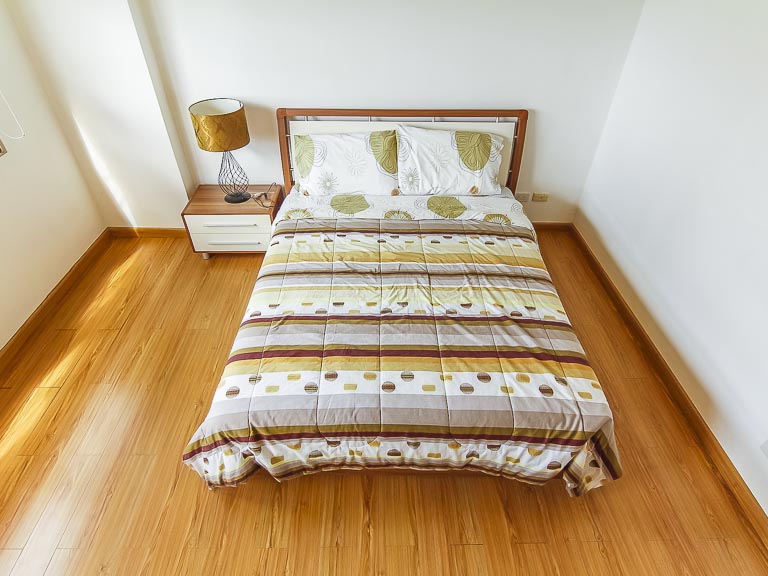 - Bedroom is provided with a big comfortable bed on a wooden floor with a lamp and an ample wardrobe