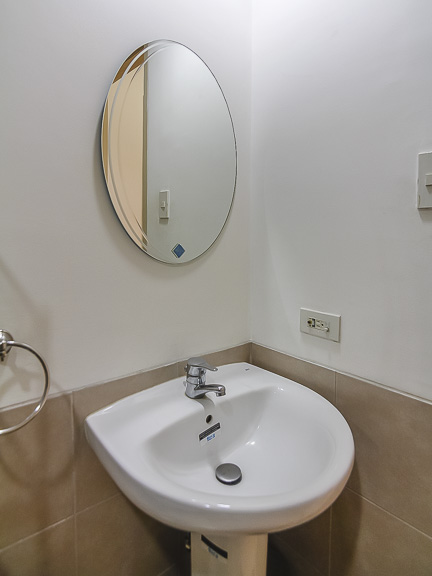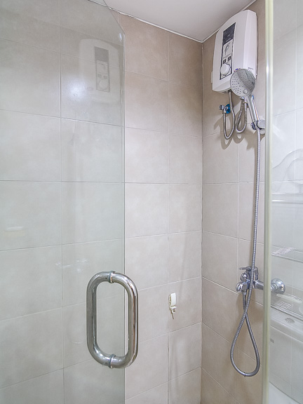 - Bathroom equipped with a side bar adjustable shower head in shower area