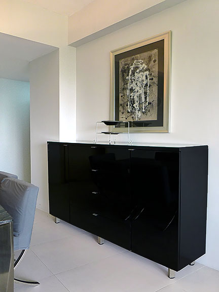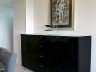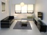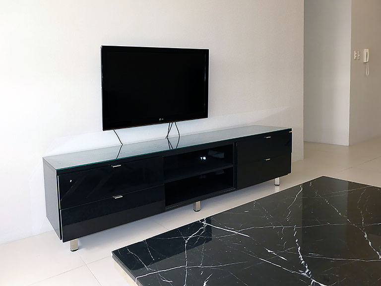 - Living area with black leather sofa, flat screen television, center table and cabinet