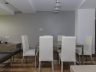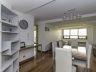• Dining room with a six-sitter wooden rectangular table and off-white fabric upholstered chairs, plus a decorative white-painted wall rack with multi-sized shelves