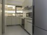 • L-formation Kitchen with matte tile flooring and big windows, cream countertops and beige storage cabinets and cupboards. Appliances include a two-door cabinet type, four-burner induction range/oven, range hood and a microwave