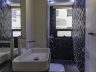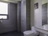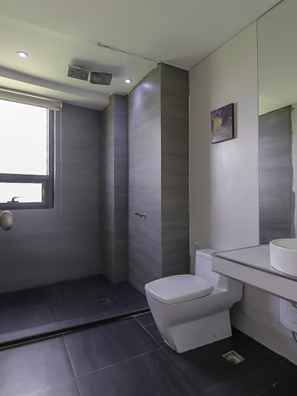 • Bathroom 2 in dark accent tile walls and grey floor tiles, rectangular vessel sink on a black granite counter