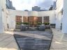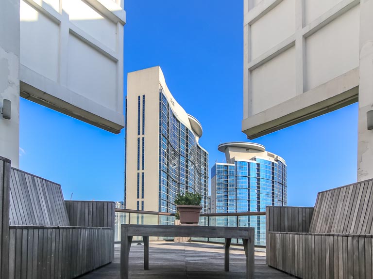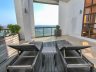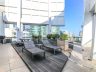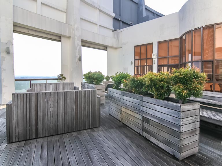 - Protective glass railings fence the roof deck, and the open verandah is furnished with lounging chairs and tables, a picnic table and benches, and plant boxes all in wooden grey slabs