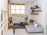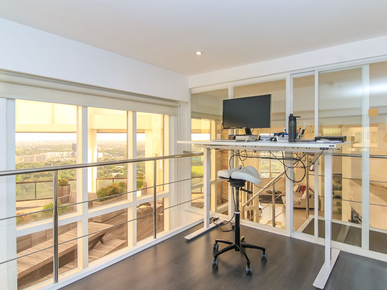- A few flight of steps lead up to the loft with metal railings. This section is sparsely furnished with a console table and a flat screen TV