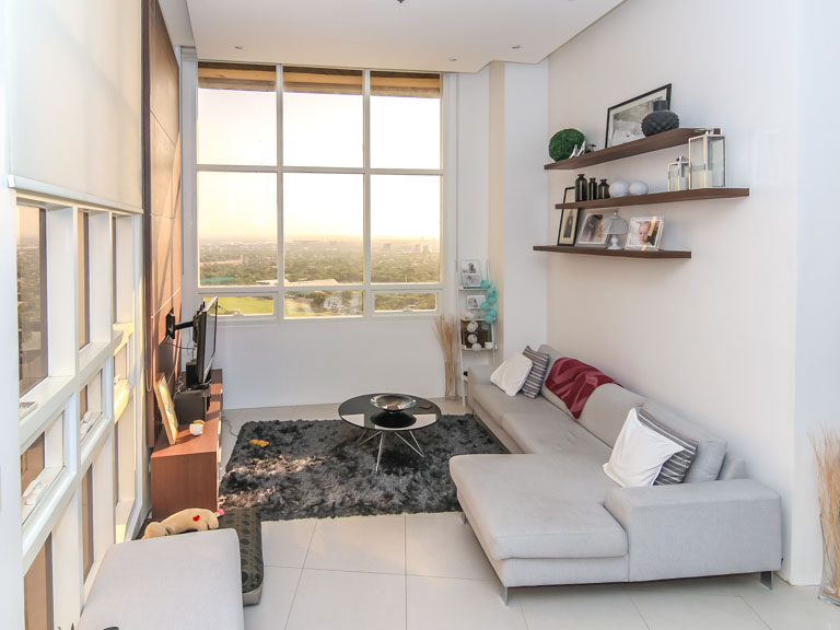 - The dainty living room at the far corner is furnished with a smoke-white long sectional sofa set, a black round center table, a brown sideboard TV stand with the flat screen TV against an accent wall, ottomans and a glass side table