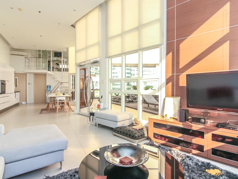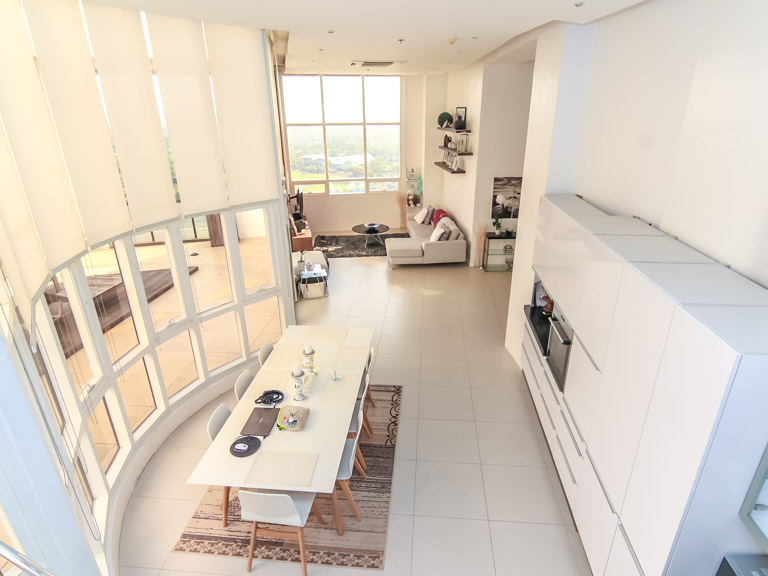 - Full glass panel windows pan the living and dining area all the way to the staircase at the other end, dividing the inside and the roof deck verandah