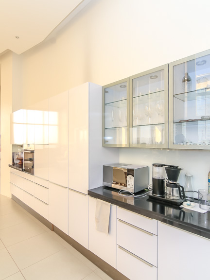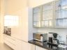 - Above the counter are wall-mounted cupboards with clear glass doors. On the counter is the microwave, a coffee maker