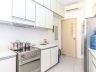 - The U-formation elongated kitchen with a split type air conditioning unit is dominated by white painted base cabinets and cupboards, and is furnished with a huge cabinet type refrigerator, an electric range and a range hood
