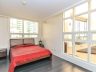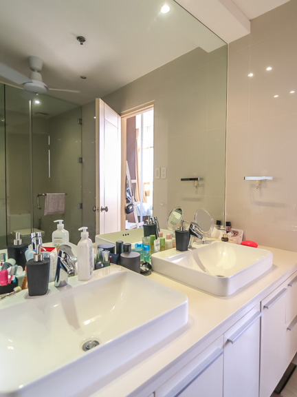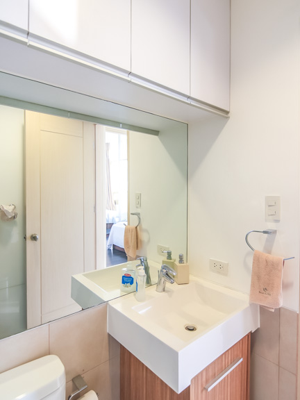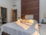 - Bedroom 1 features a queen size bed against an accent headboard wall with a niche, a low cot bed close to the widow and two bedside tables with lamps. The full wall mirror panels across the bed create an illusion of space