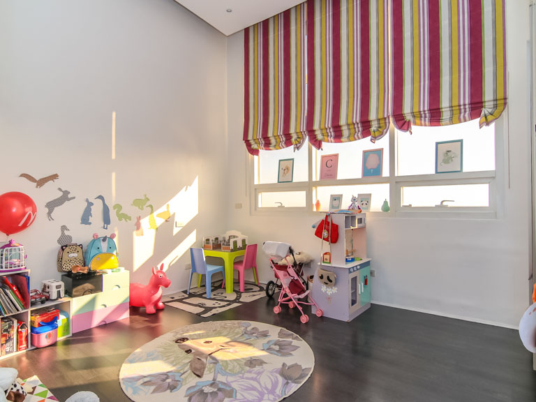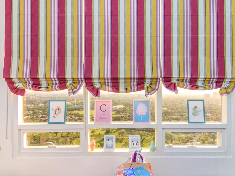 - Bedroom 2 with bright striped Roman window shades and a split-type air con unit also has a full mirror wall