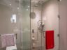 - The first bathroom is generously spaced, with a fixed rainfall shower, a shower enclosure and a white marble vanity counter with two vessel sinks and a mounted full mirror