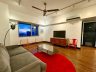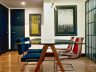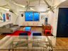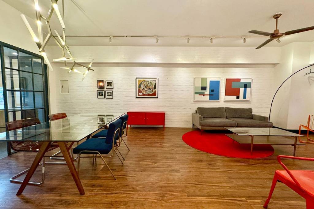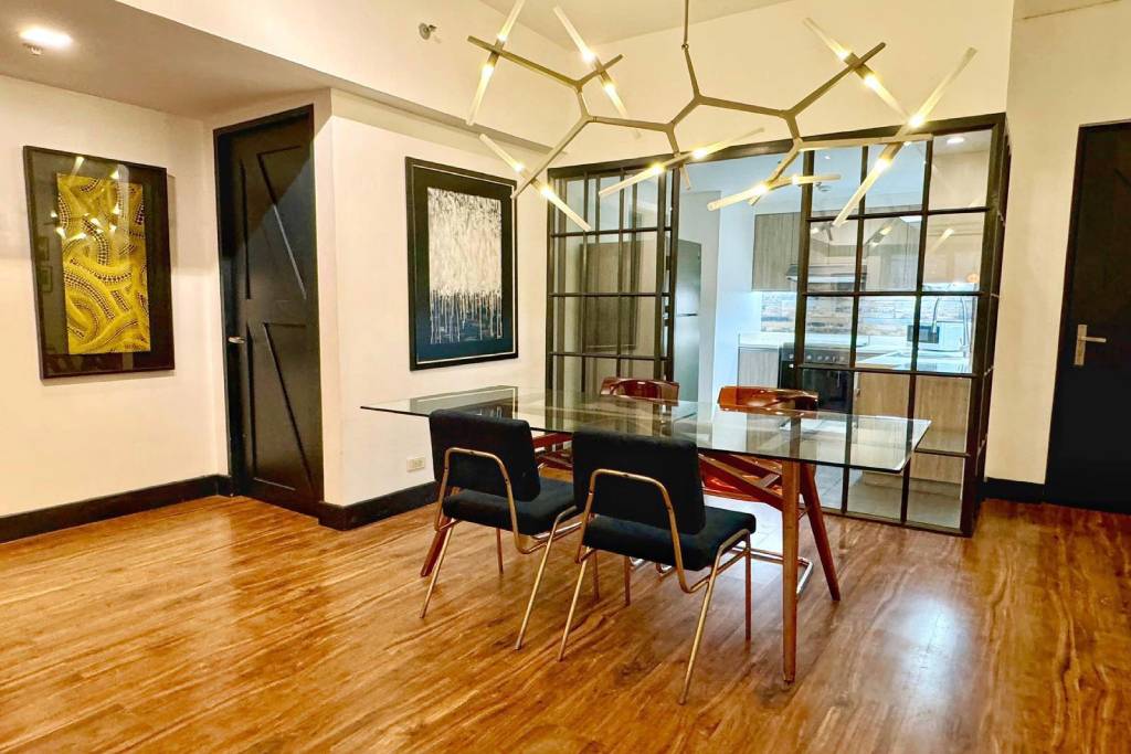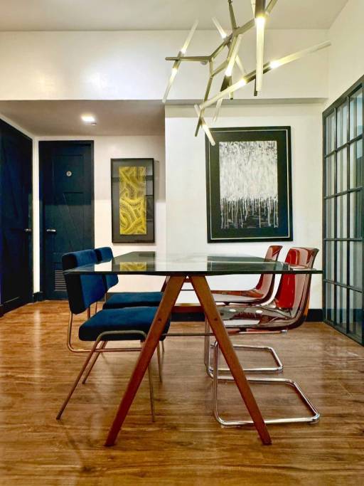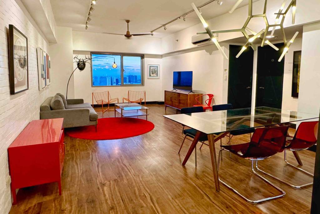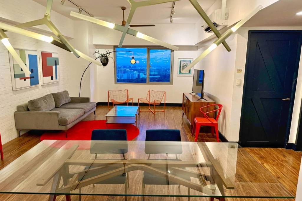 The living/dining area has a modern streamlined sofa with overhead reading lamp, coffee table, LED TV, glass dining table with a high-concept modern industrial pendant light