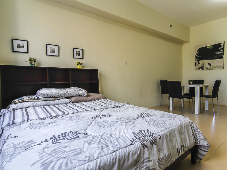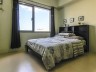 - Comfy full twin bed, with pillows, comforter and linens, shelved wood headboard