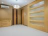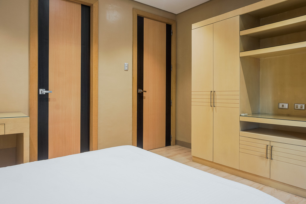 Across each bed is a wall rack with built-in cabinets, with provision for a TV stand and shelves