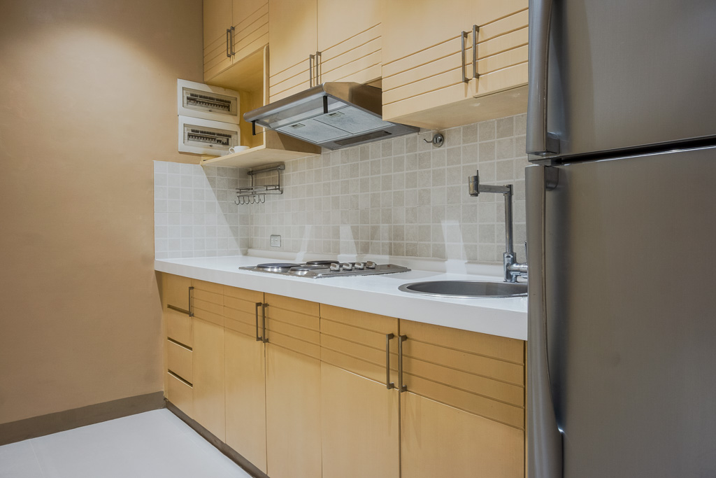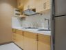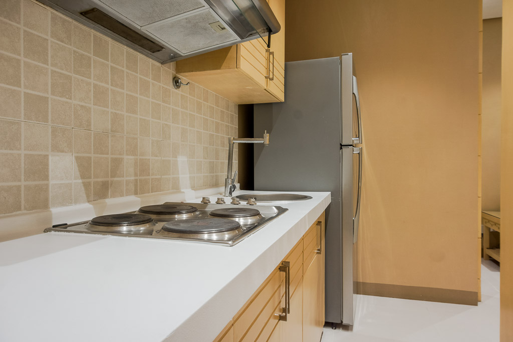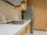 The kitchen is in a single wall layout with off-white granite counter top, base cabinets and cupboards with the theme fixtures color. Appliances include a silver gray two-door ref, a microwave and an electric cook-top