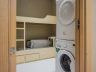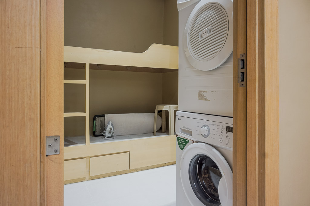A double-decker bed and a stack-up washing machine and dryer occupy the laundry room
