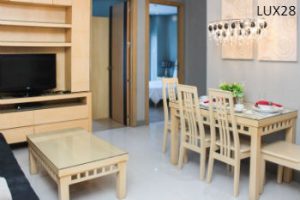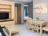 • The living and dining areas are in a continuous layout with a themed furniture design