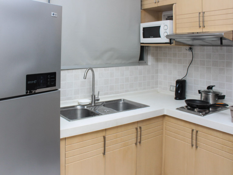 • The dainty kitchen is in an L- formation with cream counter-tops and back-splash tiles and a double sink. Base cabinets and wall-mounted cupboards provide multiple storage space. Kitchen appliances include a two-door refrigerator, a two-burner electric cook-top and a microwave
