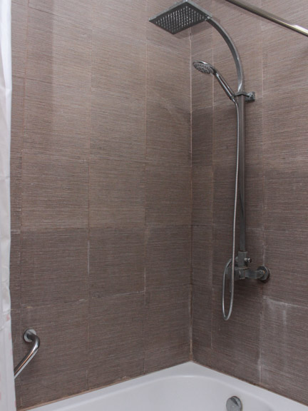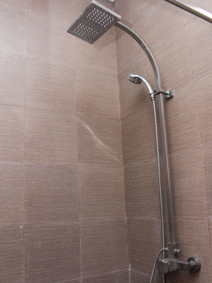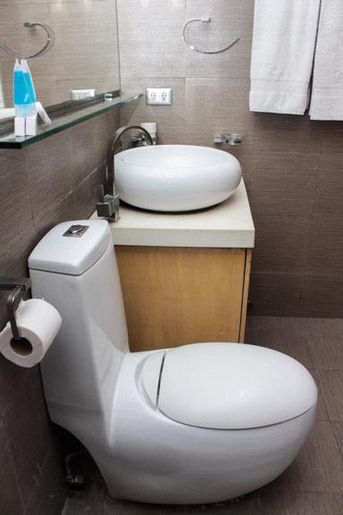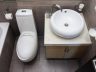 • The bathroom is generously-spaced, with a bathtub, rainfall shower, a vessel sink and a modern toilet