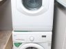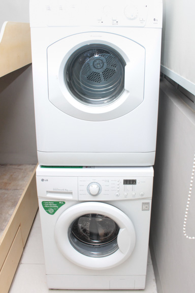 • A stack-up washing machine and dryer occupy the laundry room, with a double-deck bunk bed