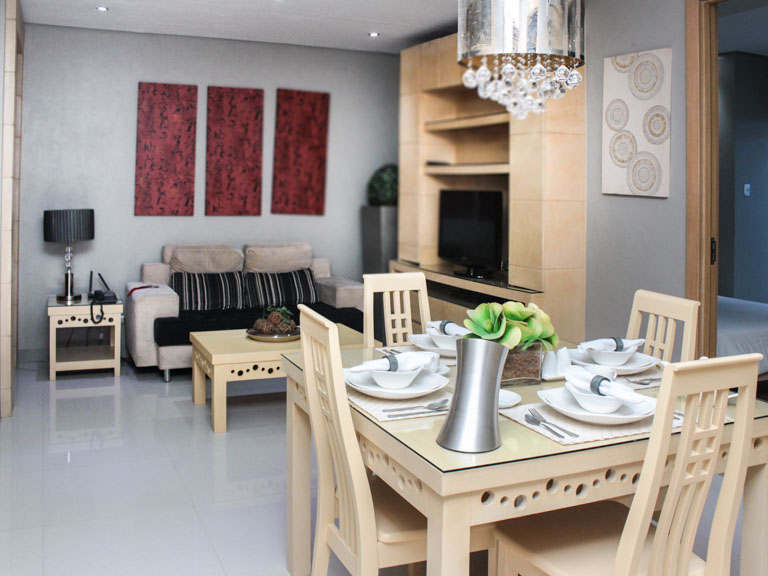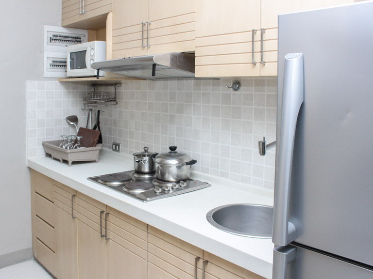 • Comes with a fully equipped kitchen, including a two-door fridge, electric cook-top with range hood and microwave oven