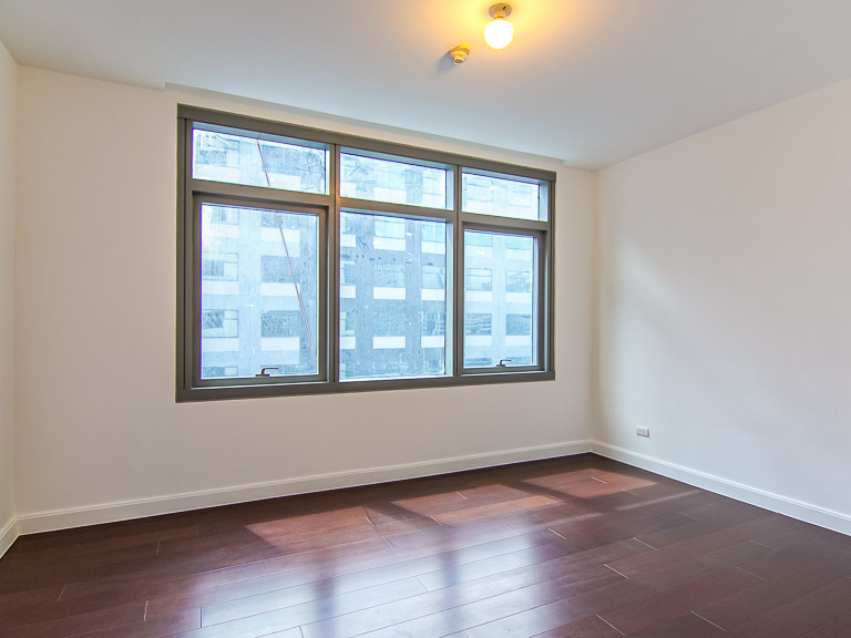 - The living/dining room features a full wall of floor-length windows that wrap around the unit’s outside corner to provide maximum natural light