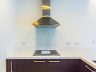 - The kitchen is fitted with an induction cooktop, range hood, bar counter, and provision for a large refrigerator