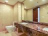 - The master bathroom features a twin sink configuration and a ceiling-mounted rainfall shower