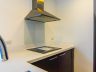 • The kitchen is fitted with a side-by-side refrigerator, induction cooktop, range hood, and bar counter