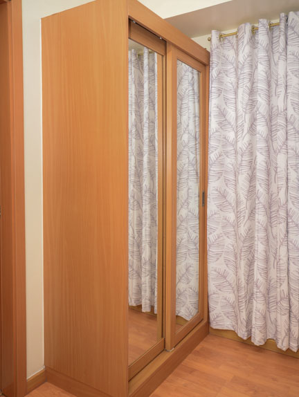 - In the bedroom is a queen-sized platform bed with a headboard near the window and a wardrobe cabinet with mirrored sliding doors