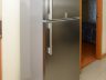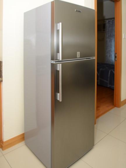 - Kitchen appliances include a four-burner electric range with hood, a microwave, and a two-door refrigerator