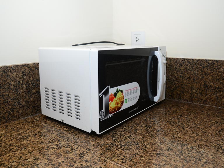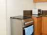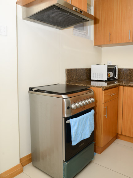 - Mounted cupboards and base cabinets under brown granite counter-tops provide sufficient kitchen storage