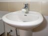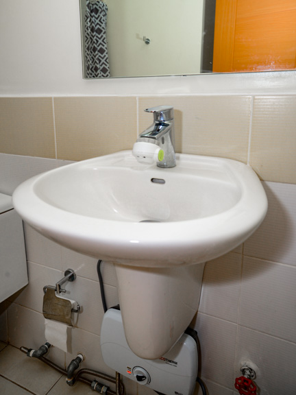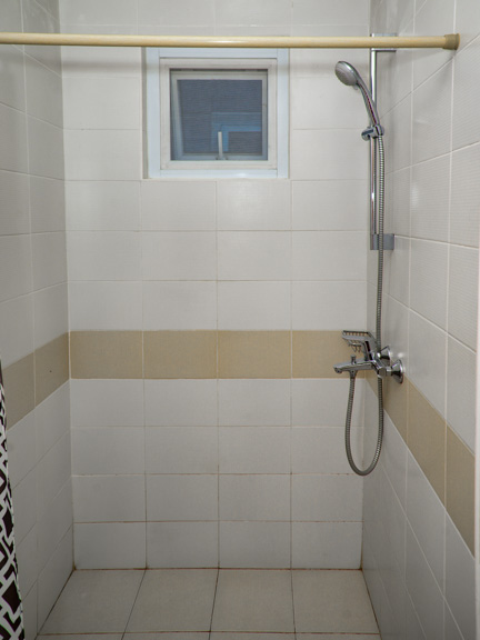 - The bathroom, with an added window ventilation, is fitted with a hand-held shower-head, a shower curtain enclosure, and a wall-mounted bathroom sink