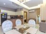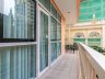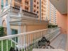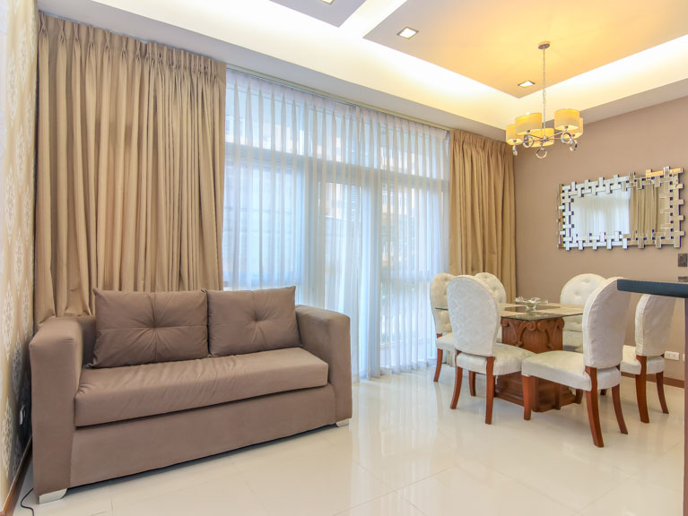 - A glass panel wall spans the entire living room to the dining area with double floor to ceiling curtains of white lace and heavy beige