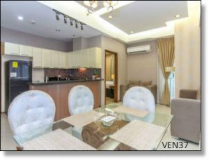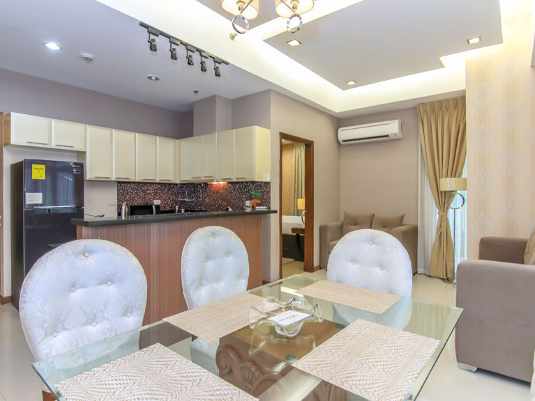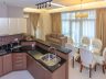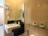 - Shades of beige dominate the tone of this unit in its designed wall covers, curtains and tile flooring