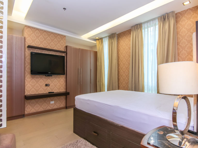 - The wall across the bed is mounted with a flat tv screen with mounted shelves above and below it