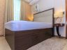 - The chocolate brown queen-sized bed has 4 pull-out drawers and an upholstered headboard
