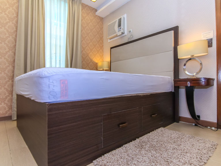 - The Room air-conditioning unit is mounted slightly above the headboard