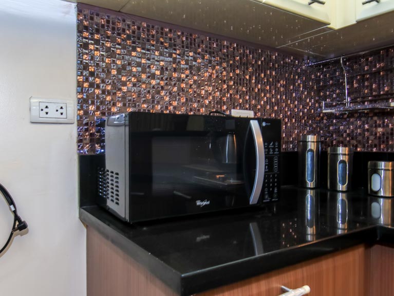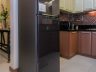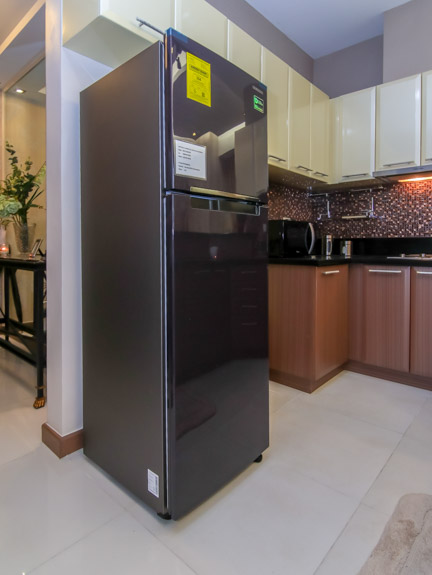 - The kitchen is furnished with a two-door refrigerator and a microwave