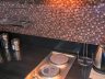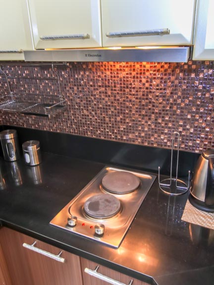 - The black marble kitchen counter sits the stainless vessel sink and the cooktop, under which base cabinets are installed