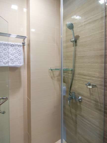 - The enclosed shower room is fitted with a stainless towel rack and a handheld rain drop shower
